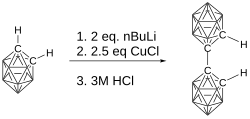 Upon treatment of ortho-carboranes with organolithium reagents such as n-Butyllithium, the CH vertices of the carborane cage can be deprotonated, affording the dilithiated ortho-carborane cage. Taking advantage of this more active carbon-lithium bond, the metalated carborane cages can then be treated with copper(I) chloride while in organic solvents, resulting in a copper-mediated carbon-carbon coupling reaction of the carborane cages. The copper salt is needed to avoid unwanted carbon-boron and boron-boron coupling reactions. The reaction mixture is allowed to stir at room temperature for two days, forming a copper-metalated carborane cage. Finally, the mixture is treated with 3M hydrochloric acid to quench the reaction process. The crude product is then purified via column chromatography and affords one half-equivalent of the carbon-carbon linked dimer of the original ortho-carborane in high yields. Worth noting is the effect of donating solvents on the yields of the reactions, as yields in solvents such as tetrahydrofuran and diethyl ether afford product in greatly decreased yields.[16]