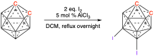 For example, the boron vertices at the 9 and 12 positions opposite to the carbon vertices can be iodinated using iodine and a catalytic amount of AlCl3 while in refluxing dichloromethane.[12]