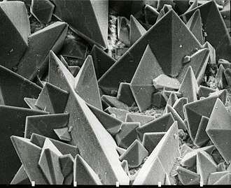 Scanning electron micrograph of the surface of a kidney stone showing tetragonal crystals of weddellite (calcium oxalate dihydrate) emerging from the amorphous central part of the stone; the horizontal length of the picture represents 0.5 mm of the figured original.