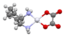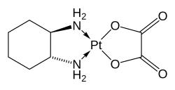 The compound features a square planar platinum(II) center. In contrast to other drugs of the platinum-based antineoplastic class of drugs cisplatin and carboplatin, oxaliplatin features the bidentate ligand trans-1,2-diaminocyclohexane in place of the two monodentate ammine ligands. It also features a bidentate oxalate group.[6] The three-dimensional structure of the molecule has been elucidated by X-ray crystallography, although the presence of pseudosymmetry in the crystal structure has caused confusion in its interpretation.[23]