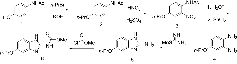 4‑Hydroxyacetamide (1) is alkylated with n-propyl bromide in the presence of potassium hydroxide to give the ether (2). Nitration of this product with nitric and sulfuric acids proceeds at the position ortho to the amide group (3), which is then reduced with SnCl2 to yield the phenylenediamine derivative (4). Reaction of that intermediate with S-methyl isothiourea proceeds first by aromatic cyclisation to the guanidine derivative followed by elimination of methyl mercaptan to yield the 2-aminobenzimidazole system (5). Acylation with methyl chloroformate results in the formation of a urethane on the amino group to produce oxibendazole (6).