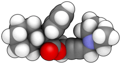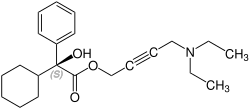 Oxybutynin contains one stereocenter. Commercial formulations are sold as the racemate. The (R)-enantiomer is a more potent anticholinergic than either the racemate or the (S)-enantiomer, which is essentially without anticholinergic activity at doses used in clinical practice.[28][29] However, (R)-oxybutynin administered alone offers little or no clinical benefit above and beyond the racemic mixture. The other actions (calcium antagonism, local anesthesia) of oxybutynin are not stereospecific. (S)-Oxybutynin has not been clinically tested for its spasmolytic effects, but may be clinically useful for the same indications as the racemate, without the unpleasant anticholinergic side effects.