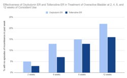 Oxybutynin has been established through head-to-head trials as a more effective for overactive bladder than tolterodine, another anticholinergic medication. Specifically, the extended-release form of oxybutynin was found to have greater effect in both the short- and long-term.[11] However, oxybutynin is not selective for the bladder like tolterodine, and thus has a wider range of side effects. Tolterodine and other anticholinergics are primarily used when clinicians and patients want to reduce the side effect profile.[13]
