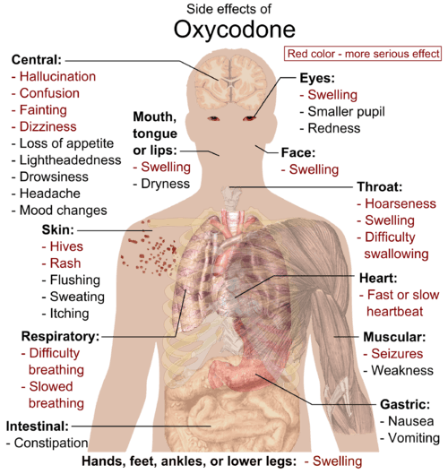 The most common side effects of oxycodone include delayed gastric emptying, euphoria, anxiolysis (a reduction in anxiety), feelings of relaxation, and respiratory depression.[49] Common side effects of oxycodone include constipation (23%), nausea (23%), vomiting (12%), drowsiness (23%), dizziness (13%), itching (13%), dry mouth (6%), and sweating (5%).[49][50] Less common side effects (experienced by less than 5% of patients) include loss of appetite, nervousness, abdominal pain, diarrhea, urinary retention, dyspnea, and hiccups.[51]