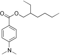 Padimate O is an organic compound related to the water-soluble compound PABA (4-aminobenzoic acid) that is used as an ingredient in some sunscreens. This yellowish water-insoluble oily liquid is an ester formed by the condensation of 2-ethylhexanol with dimethylaminobenzoic acid. Other names for padimate O include 2-ethylhexyl 4-dimethylaminobenzoate, Escalol 507, octyldimethyl PABA, and OD-PABA.
