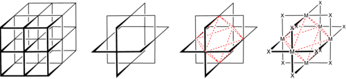 Evolution of β-PdCl2 structure: Start with cubic lattice, remove corner and centered lattice points, inscribe octahedron (red lines), label corners as X (twelve Cl centers) and face-centered atoms as M (six Pd(II) centers).
