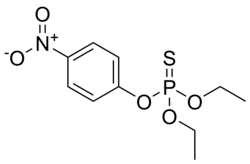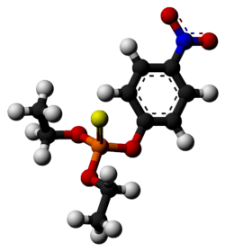 Parathion, also called parathion-ethyl or diethyl parathion, is an organophosphate insecticide and acaricide. It was originally developed by IG Farben in the 1940s. It is highly toxic to non-target organisms, including humans, so its use has been banned or restricted in most countries. In response to safety concerns, the less toxic but still dangerous analogue parathion methyl was later developed.[5][6]