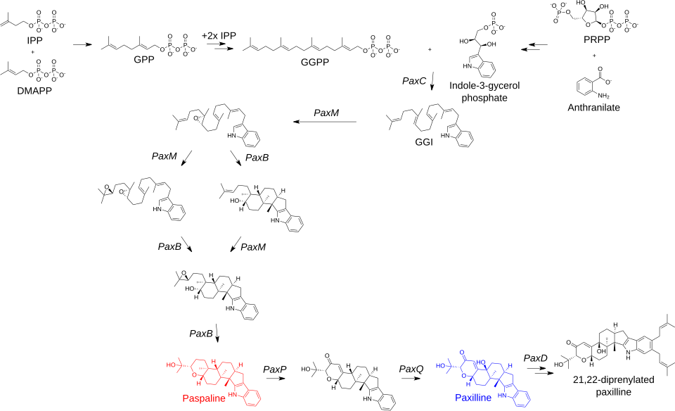Paxiline biosynthesis starts with the synthesis of geranylgeranyl pyrophosphate via the terpenoid pathway and indole-3-glycerol phosphate, which is an intermediate in the tryptophan biosynthesis pathway.[8] By expressing six genes known to be necessary for Paxilline synthesis in Aspergillus oryzae, the further steps in the biosynthesis were identified; two epoxidations and two cyclizations yield paspaline, then two oxidation reactions and a demethylation complete the synthesis.[9] This biosynthesis is notable for its unusual stereospecific polycyclization mechanism that has not been replicated in a chemical synthesis, though other mechanisms have been devised for total synthesis of Paxilline.[10] Paxilline has also been found to be mono- or di-prenylated with DMAPP by an atypical prenyltransferase enzyme.[11]