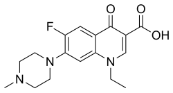 Pefloxacin is a broad-spectrum antibiotic that is active against both Gram-positive and Gram-negative bacteria. It functions by inhibiting DNA gyrase, a type II topoisomerase, and topoisomerase IV,[5] which is an enzyme necessary to separate, replicated DNA, thereby inhibiting cell division.