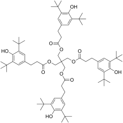 Pentaerythritol tetrakis(3,5-di-tert-butyl-4-hydroxyhydrocinnamate) is a chemical compound composed of four sterically hindered phenols linked through a pentaerythritol core. It is used as primary antioxidant for stabilizing polymers, particularly polyethylene and polypropylene.