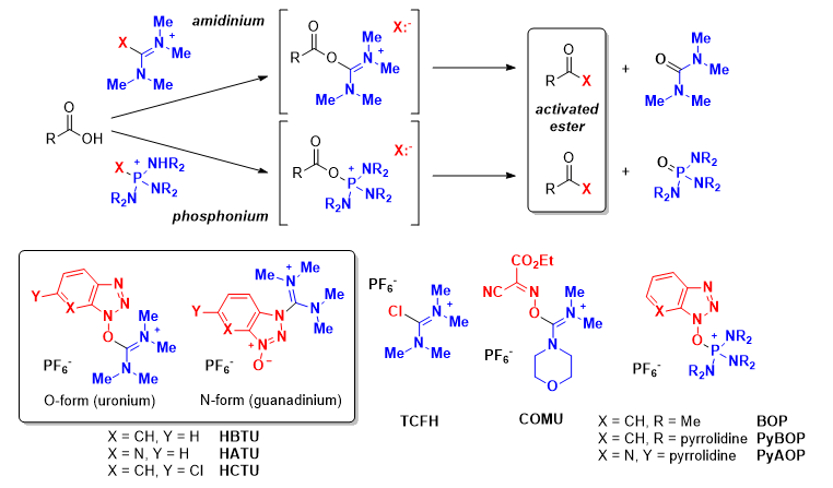 To avoid epimerization through the O-acylisourea intermediate formed when using a carbodiimide reagent, an amidinium- or phosphonium-reagent can be employed These reagents have two parts: an electrophilic moiety which deoxygenates the carboxylic acid (blue) and masked nucleophilic moiety (red). Nucleophilic attack of the carboxylic acid on the electrophilic amidinium or phosphonium moiety leads to a short lived intermediate which is rapidly trapped by the unmasked nucleophile to form the activated ester intermediate and either a urea or phosphoramide by-product. These cationic reagents have non-coordinating counteranions such as a hexafluorophosphate or a tetrafluoroborate.[13] The identity of this anion is typically indicated by the first letter in the reagent's acronym, although the nomenclature can be inconsistent. For example HBTU is a hexafluorophosphate salt while TBTU is a tetrafluoroborate salt. In addition to HBTU and HATU other common reagents include HCTU (6-ClHOBt), TCFH (chloride) and COMU (ethyl cyano(hydroxyimino)acetate). Amidinium reagents incorporating hydroxybenzotriazole moieties can exist in an N-form (guanadinium) or an O-form (uronium), but the N-form is generally more stable.[20] Phosphonium reagents include BOP (HOBt), PyBOP (HOBt) and PyAOP (HOAt).[21] Although these reagents can lead to the same activated ester intermediates as a carbodiimide reagent, the rate of activation is higher due to the high electrophilicity of these cationic reagents.[22] Amidinium reagents are capable of reacting with the peptide N-terminus to form an inactive guanidino by-product, whereas phosphonium reagents are not.[23]