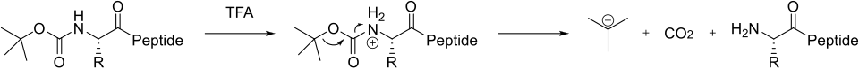 Before the advent of SPPS, solution methods for chemical peptide synthesis relied on tert-butyloxycarbonyl (abbreviated 'Boc') as a temporary N-terminal α-amino protecting group. The Boc group is removed with acid, such as trifluoroacetic acid (TFA). This forms a positively charged amino group in the presence of excess TFA (note that the amino group is not protonated in the image on the right), which is neutralized and coupled to the incoming activated amino acid.[30] Neutralization can either occur prior to coupling or in situ during the basic coupling reaction.