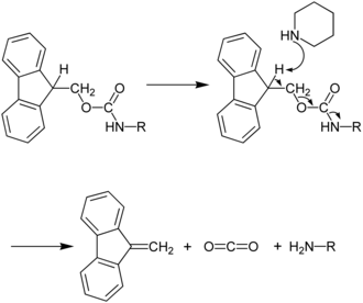 Cleavage of the Fmoc group. Treatment of the Fmoc-protected amine with piperidine results in proton abstraction from the methine group of the fluorenyl ring system. This leads to release of a carbamate, which decomposes into carbon dioxide (CO2) and the free amine. Dibenzofulvene is also generated. This reaction is able to occur due to the acidity of the fluorenyl proton, resulting from stabilization of the aromatic anion formed. The dibenzofulvene by-product can react with nucleophiles such as the piperidine (which is in large excess), or potentially the released amine.[32]