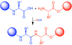 In organic chemistry, peptide synthesis is the production of peptides, compounds where multiple amino acids are linked via amide bonds, also known as peptide bonds. Peptides are chemically synthesized by the condensation reaction of the carboxyl group of one amino acid to the amino group of another. Protecting group strategies are usually necessary to prevent undesirable side reactions with the various amino acid side chains.[1] Chemical peptide synthesis most commonly starts at the carboxyl end of the peptide (C-terminus), and proceeds toward the amino-terminus (N-terminus).[2] Protein biosynthesis (long peptides) in living organisms occurs in the opposite direction.