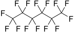 Perfluorohexane (C6F14), or tetradecafluorohexane, is a fluorocarbon. It is a derivative of hexane in which all the hydrogen atoms are replaced by fluorine atoms. It is used in one formulation of the electronic cooling liquid/insulator Fluorinert for low-temperature applications due to its low boiling point of 56 °C and freezing point of −90 °C. It is odorless and colorless. Unlike typical hydrocarbons, the structure features a helical carbon backbone.[1] In medical imaging it is used as a contrast agent.