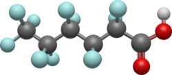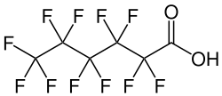 Perfluorohexanoic acid (PFHxA) is a perfluorocarboxylic acid derivative of hexanoic acid. Side-chain fluorinated polymers and fluorotelomer compounds with five carbon atoms or more commonly degrade into perfluorohexanoic acid.[3][4]