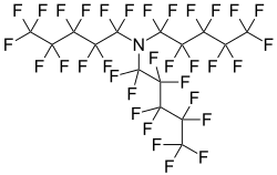 Perfluorotripentylamine is an organic compound with the chemical formula N((CF2)4CF3)3. A molecule of this chemical compound consists of three pentyl groups connected to one nitrogen atom, in which all of the hydrogen atoms are replaced with fluorine atoms. It is a perfluorocarbon. It is used as an electronics coolant, and has a high boiling point. It is colorless, odorless, and insoluble in water. Unlike ordinary amines, perfluoroamines are of low basicity. Perfluorinated amines are components of fluorofluids, used as immersive coolants for supercomputers.[1]