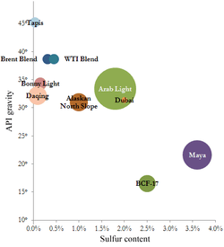 Some marker crudes with their sulfur content (horizontal) and API gravity (vertical) and relative production quantity.