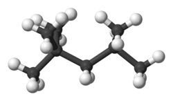 2,2,4-Trimethylpentane, a hydrocarbon with the octane number of 100. Black spheres are carbon and white spheres are hydrogen atoms.