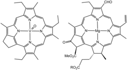 Structure of a vanadium porphyrin compound (left) extracted from petroleum by Alfred E. Treibs, father of organic geochemistry. Treibs noted the close structural similarity of this molecule and chlorophyll a (right).[71][72]