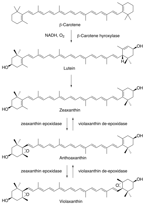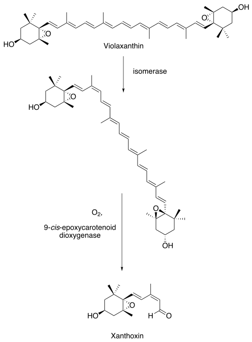 Phaseic acid is a product of abscisic acid, which is itself the product of the C40 carotenoid zeaxanthin via at least four enzymatic steps. Zeaxanthin is epoxidized to form violaxanthin or neoxanthin. The C15 end of the molecule is then cleaved by an epoxycarotenoid epoxygenase to form xanthoxin, an aldehyde.
