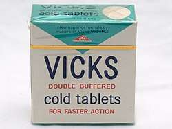 Vicks cold tablets, containing: salicylamide, phenacetin 2+12 grs., pyrilamine maleate, caffeine, ephedrine sulphate, magnesium hydroxide, and aluminum hydroxide complex (U.S. Pat. 2,446,981). That patent number is from 1948; these tablets would have been made shortly thereafter.