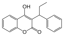 Phenprocoumon (marketed under the brand names Marcoumar, Marcumar and Falithrom) is a long-acting anticoagulant to be taken by mouth, and a coumarin derivative.[2] It acts as a vitamin K antagonist and inhibits blood clotting (coagulation) by blocking synthesis of coagulation factors II, VII, IX and X. It is used for the prophylaxis and treatment of thromboembolic disorders such as heart attacks and pulmonary (lung) embolism. The most common adverse effect is bleeding. The drug interacts with a large number of other medications, including aspirin and St John's Wort. It is the standard coumarin used in Germany,[3] Austria,[4] and other European countries.[5]