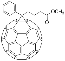 PCBM ([6,6]-phenyl-C61-butyric acid methyl ester) is a fullerene derivative being investigated for its potential use in organic solar cells.[3]