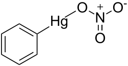 Phenylmercuric nitrate is an organomercury compound with powerful antiseptic and antifungal effects.[1] It was once commonly used as a topical solution for disinfecting wounds, but as with all organomercury compounds it is highly toxic, especially to the kidneys, and is no longer used in this application. However it is still used in low concentrations as a preservative in eye drops for ophthalmic use, making it one of the few organomercury derivatives remaining in current medical use.[2]