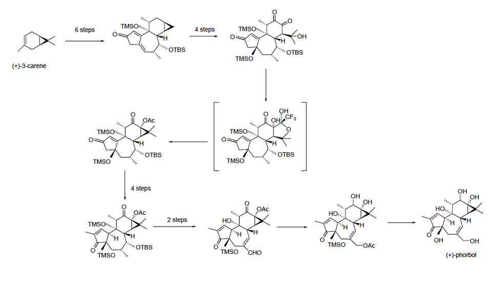 A total synthesis of enantiopure phorbol was developed in 2015. While this synthesis will not replace natural isolation products, it will enable researchers to create phorbol analogs for use in research, especially creating phorbol derivatives that can be evaluated for anti-cancer activity.[16] Previously, the difficulty with synthesizing phorbol had been creating C–C bonds, especially in the six-membered ring at the top of the molecule. This synthesis starts from (+)-3-carene, and uses a series of 19 steps to eventually create (+)-phorbol.[20][21][16]