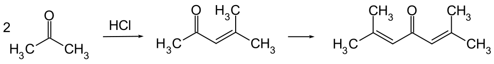 It is now typically obtained by the acid-catalysed twofold aldol condensation of three molecules of acetone. Mesityl oxide is obtained as an intermediate and can be isolated.[5]