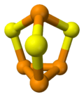 The molecule has C3v symmetry. It is a derivative of the tetrahedral (P4) unit from insertion of sulfur into three P-P bonds. The P-S and P-P distances are 2.090 and 2.235 Å, respectively. P4Se3 and P4S3 adopt the same structures.[1] These compounds can be melted together and form mixed crystals of one dissolved in the other.[4] Under higher temperatures, mixed chalcogenide molecules P4S2Se and P4SSe2 will form.[5]