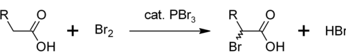 Another use for PBr3 is as a catalyst for the α-bromination of carboxylic acids. Although acyl bromides are rarely made in comparison with acyl chlorides, they are used as intermediates in Hell-Volhard-Zelinsky halogenation.[11] Initially PBr3 reacts with the carboxylic acid to form the acyl bromide, which is more reactive towards bromination. The overall process can be represented as