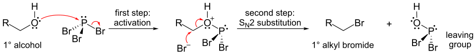 An important reaction of PBr3 is with alcohols, where it replaces an OH group with a bromine atom to produce an alkyl bromide. All three bromides can be transferred.[4]