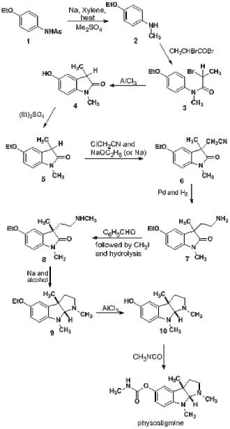 Physostigmine has two stereocenters—the two carbons where the five-membered rings join—so any attempt at the total synthesis must pay attention to obtaining the correct stereoisomer. The 71 syntheses of physostigmine yield 33 racemic mixtures and 38 products of a single enantiomer. The first total synthesis of physostigmine was achieved by Julian and Pikl in 1935.[18] The main goal of Julian's formal physostigmine synthesis was to prepare the key compound (L)-eseroline (compound 10 in the adjacent diagram), the conversion of which to physostigmine would be straightforward. In one of his earlier works[19] Julian synthesized the ring of physostigmine from 1-methyl-3-formyl-oxindole as starting material, which was discovered by Paul Friedländer. However, the starting material was expensive, and the reduction of a nitrile to an amine (similar to the reaction of compound 6 to give compound 7 in the diagram) with sodium and alcohol did not proceed in good yield. In his second work "Studies in the Indole Series III," he had improved the yield of amine from nitrile significantly by using palladium and hydrogen. Although he succeeded in the synthesis of the target compound, the route had several drawbacks. First, the chemical resolution of compound 8 is unreliable, and the chemical resolution of ''rac''-eserethole gives optically pure product only after eight recrystallizations of its tartrate salt. Second, the reductive amination going from compound 8 to compound 9 requires a large amount of Na. In the years since this initial work, many other groups have used a variety of approaches to construct the ring system and showcase new synthetic methods.