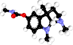 Physostigmine, an acetylcholinesterase inhibitor, can be used to treat glaucoma and delayed gastric emptying. Because it enhances the transmission of acetylcholine signals in the brain and can cross the blood–brain barrier, physostigmine salicylate is used to treat anticholinergic poisoning (that is, poisoning by substances that interfere with the transmission of acetylcholine signaling, such as atropine, scopolamine, and other anticholinergic drug overdoses).[2] It is also used to reverse neuromuscular blocking. Physostigmine is the antidote of choice for Datura stramonium poisoning. It is also an antidote for Atropa belladonna poisoning, the same as for atropine.[3] It has also been used as an antidote for poisoning with GHB,[4] but is poorly effective and often causes additional toxicity, so is not a recommended treatment.[5] It can also be used as an antidote for dimenhydrinate or diphenhydramine poisoning.[6]