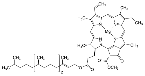 The major source of phytane and pristane is thought to be chlorophyll.[5] Chlorophyll is one of the most important photosynthetic pigments in plants, algae, and cyanobacteria, and is the most abundant tetrapyrrole in the biosphere.[6] Hydrolysis of chlorophyll a, b, d, and f during diagenesis in marine sediments, or during invertebrate feeding[7] releases phytol, which is then converted to phytane or pristane.