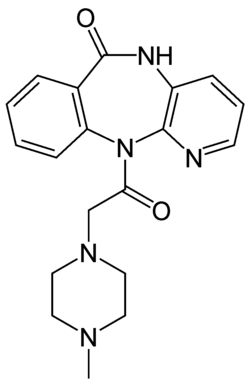Pirenzepine (Gastrozepin), an M1 selective antagonist, is used in the treatment of peptic ulcers, as it reduces gastric acid secretion and reduces muscle spasm. It is in a class of drugs known as muscarinic receptor antagonists; acetylcholine is the neurotransmitter of the parasympathetic nervous system which initiates the rest-and-digest state (as opposed to fight-or-flight), resulting in an increase in gastric motility and digestion; whereas pirenzepine would inhibit these actions and cause decreased gastric motility leading to delayed gastric emptying and constipation.[1] It has no effects on the brain and spinal cord as it cannot diffuse through the blood–brain barrier.