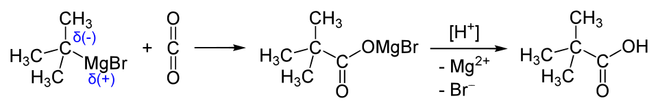 Alternative laboratory routes include the Haloform reaction of pinacolone,[3] hydrolysis of corresponding nitrile (Pivalonitrile),[4] and carbonation of the Grignard reagent formed from tert-butyl chloride:[5]
