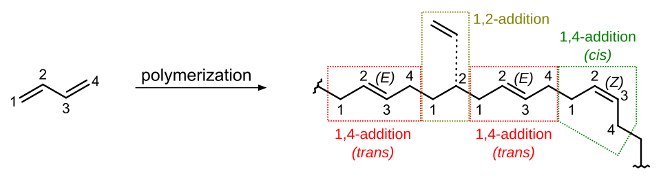 The trans double bonds formed during polymerization allow the polymer chain to stay rather straight, allowing sections of polymer chains to align to form microcrystalline regions in the material. The cis double bonds cause a bend in the polymer chain, preventing polymer chains from aligning to form crystalline regions, which results in larger regions of amorphous polymer. It has been found that a substantial percentage of cis double bond configurations in the polymer will result in a material with flexible elastomer (rubber-like) qualities. In free radical polymerization, both cis and trans double bonds will form in percentages that depend on temperature. The catalysts influence the cis vs trans ratio.
