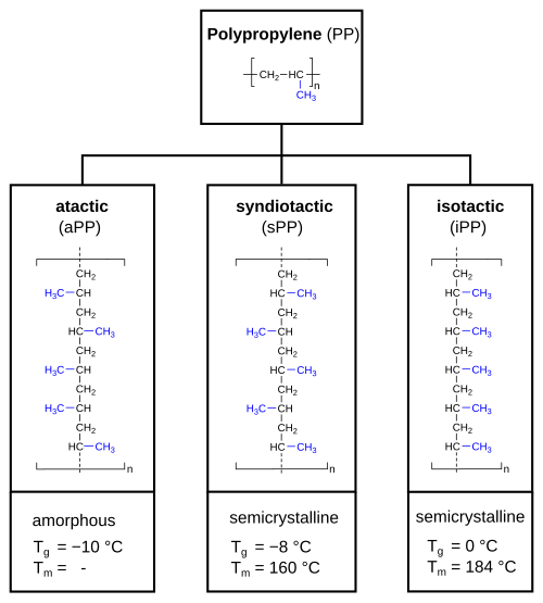 Polypropylene can be categorized as atactic polypropylene (aPP), syndiotactic polypropylene (sPP) and isotactic polypropylene (iPP). In case of atactic polypropylene, the methyl group (-CH3) is randomly aligned, alternating (alternating) for syndiotactic polypropylene and evenly for isotactic polypropylene. This has an impact on the crystallinity (amorphous or semi-crystalline) and the thermal properties (expressed as glass transition point Tg and melting point Tm).