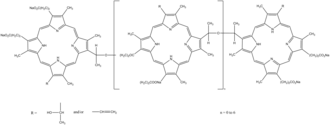 Porfimer is a mixture of oligomers formed by ether and ester linkages of up to eight porphyrin units.[1] In practice, a red light source emitting at 630 nm is used to excite the Porfimer oligomers.[2]