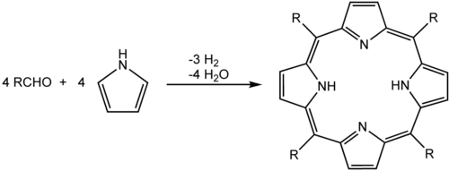 A common synthesis for porphyrins is the Rothemund reaction, first reported in 1936,[13][14] which is also the basis for more recent methods described by Adler and Longo.[15] The general scheme is a condensation and oxidation process starting with pyrrole and an aldehyde.