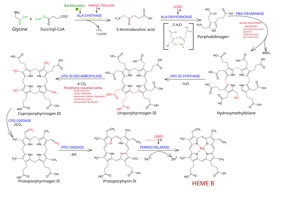 Heme biosynthesis is used as biomarker in environmental toxicology studies. While excess production of porphyrins indicate organochlorine exposure, lead inhibits ALA dehydratase enzyme.[26]