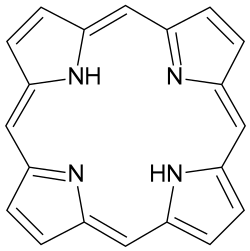 The parent of porphyrins is porphine, a rare chemical compound of exclusively theoretical interest. Substituted porphines are called porphyrins.[1] With a total of 26 π-electrons the porphyrin ring structure is a coordinated aromatic system.[2] One result of the large conjugated system is that porphyrins absorb strongly in the visible region of the electromagnetic spectrum, i.e. they are deeply colored. The name "porphyrin" derives from Greek πορφύρα (porphyra) 'purple'.[3]