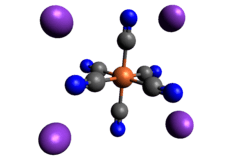 Like other metal cyanides, solid potassium ferrocyanide, both as the hydrate and anhydrous salts, has a complicated polymeric structure. The polymer consists of octahedral [Fe(CN)6]4− centers crosslinked with K+ ions that are bound to the CN ligands.[12] The K+---NC linkages break when the solid is dissolved in water.