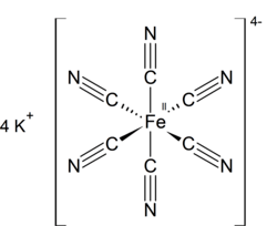 Potassium ferrocyanide is the inorganic compound with formula K4[Fe(CN)6]·3H2O. It is the potassium salt of the coordination complex [Fe(CN)6]4−. This salt forms lemon-yellow monoclinic crystals.