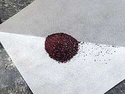 Solid potassium osmate is stable in air. It yields a red solution when dissolved in water, with which it slowly decomposes producing osmium tetroxide, however when prepared by reducing potassium perosmate with alcohol it yields a pink solution.[6][7] It is more stable in cold water under alkaline conditions, but hot water or acid accelerates decomposition. When exposed to sunlight for prolonged periods of time, it decomposes and produces a sooty powder along with the odor of the tetroxide. It is insoluble in alcohol and ether.[1][8][9]
