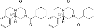 Praziquantel is administered as a racemate; the (R)-enantiomer has greater antiparasitic activity than the (S)-enantiomer, both in vitro and in vivo; the enantiomers may be separated using a resolution of an amine obtained from praziquantel, as well as by other methods.[38]