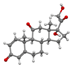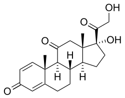 Prednisone is a synthetic glucocorticoid used for its anti-inflammatory and immunosuppressive properties.[37][38] Prednisone is a prodrug; it is metabolised in the liver by 11-β-HSD to prednisolone, the active drug. Prednisone has no substantial biological effects until converted via hepatic metabolism to prednisolone.[39]
